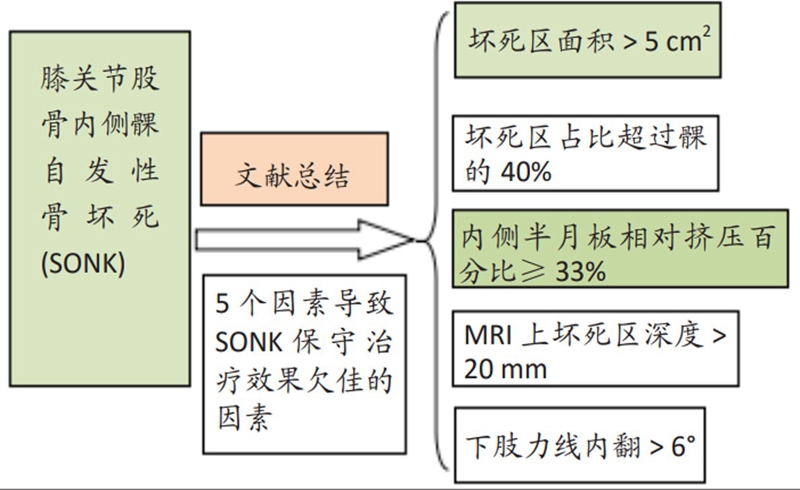 如果保守治疗3个月后症状没有减轻或MR上没有改善时,患者同时存在5个因素中的任一个,则应考虑行手术治疗,选择膝关节镜+自体骨软骨移植术(当患者下肢力线内翻<3°时)、膝关节镜+HTO术、或膝关节镜+HTO+坏死区病灶刮除+自体植骨术。