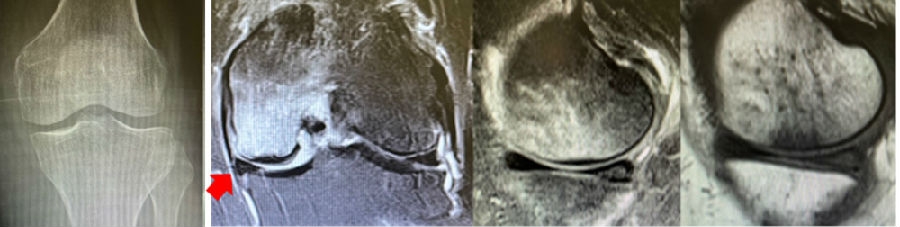 病例:女,65岁,主诉左膝关节内侧疼痛2月余。2017年11月X光未见左膝骨质异常。MR见股骨内侧髁骨坏死,半月板相对突出百分比(RPE)28.3%,合并内侧半月板后根部撕裂,矢状位病变区域前后径为11.67mm,关节线会聚角2.68°