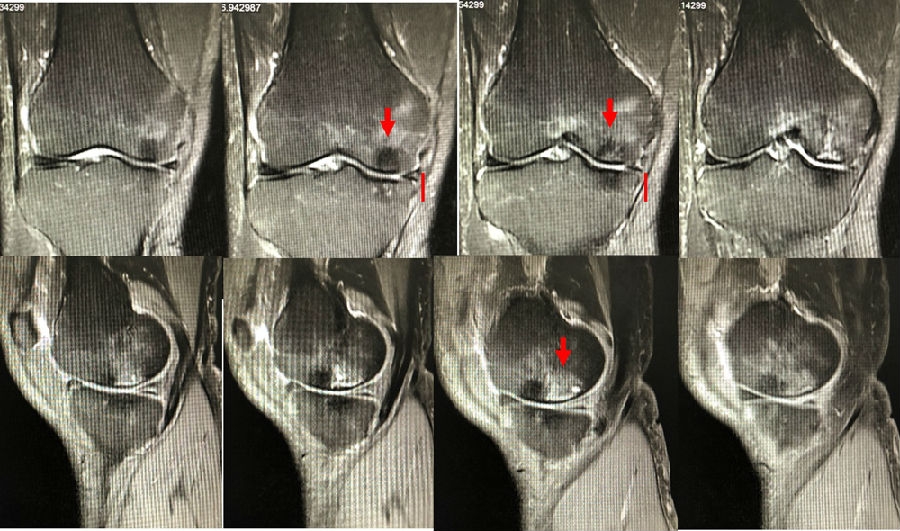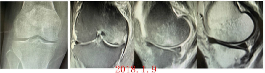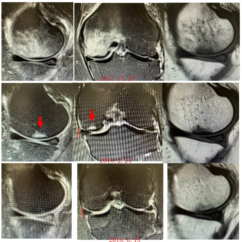 予克氏针钻减压,消炎止痛药物口服、静滴唑来膦酸钠注射液,避免负重6周,后改部分负重至3个月,患者依从性差。2018年1月复查MR见骨髓水肿少许吸收,坏死区扩大,半月板相对突出百分比(RPE)33.53%,矢状位病变区域前后径为26.89mm,患者仍有膝关节疼痛症状,建议行手术治疗,患者拒绝手术后失访。