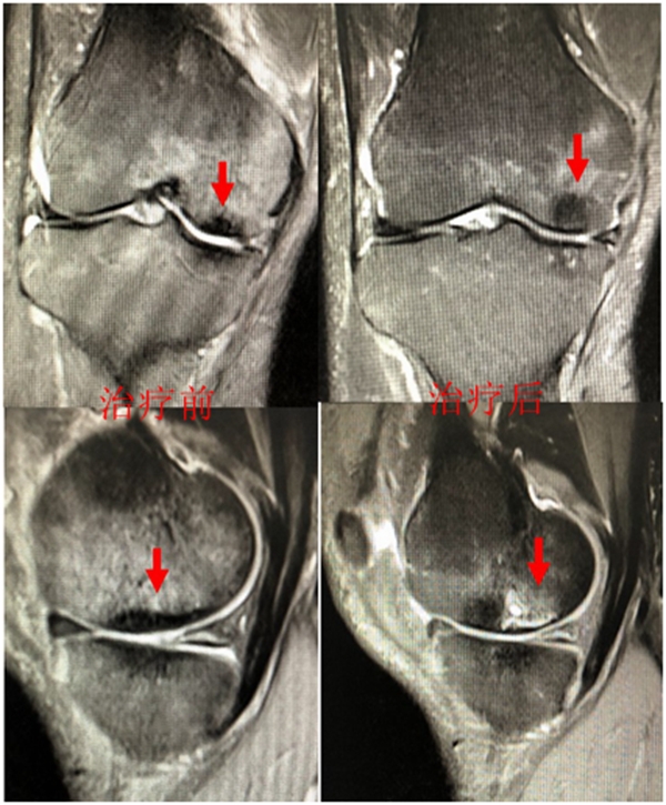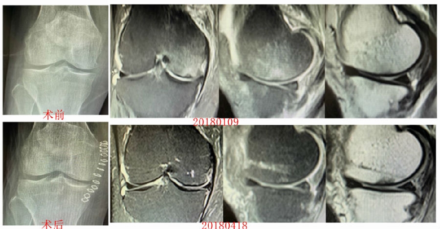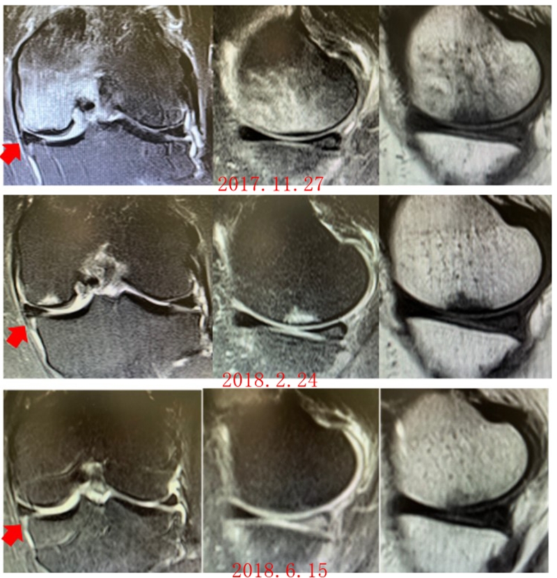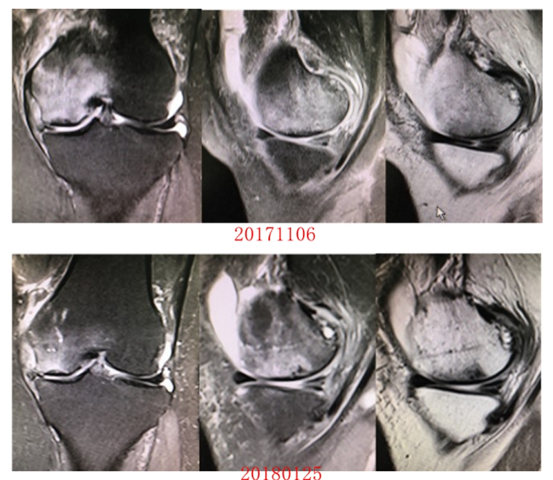 2018年6月复查MR见骨髓水肿基本完全吸收,坏死区修复良好,半月板相对突出百分比(RPE)38.54%,患者临床症状消失。