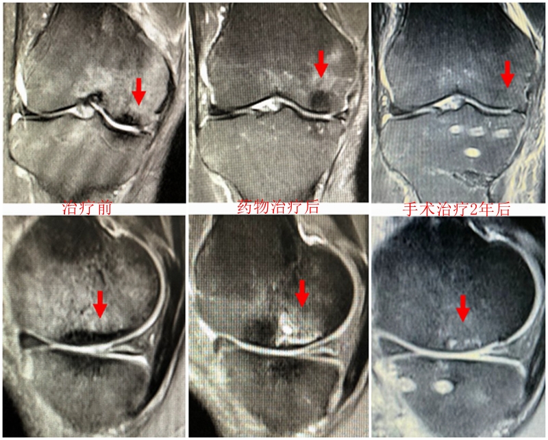 予切开行克氏针钻孔减压,口服消炎止痛药物、钙剂及骨化三醇,不负重6周,后改部分负重至3个月。2018年4月复查MR见骨髓水肿基本完全吸收,坏死区局限并修复良好,半月板相对突出百分比(RPE)32.08%,患者临床症状消失。
