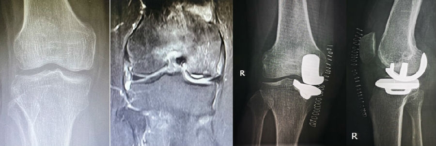 病例1:女,61岁,右膝关节诊断为Koshino Ⅲ期SONK,行右膝内侧单髁手术治疗。