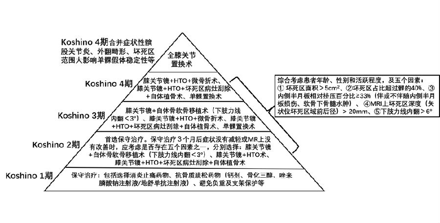需在考虑5个因素的基础上,同时兼顾考虑年龄、性别和活跃程度,分别选择用膝关节镜+自体骨软骨移植术(当患者下肢力线内翻<3°时)膝关节镜+HTO术+微骨折术、膝关节镜+HTO+坏死区病灶刮除+自体植骨术或单髁置换术。
