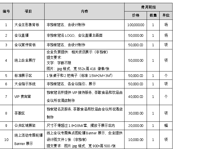 2. 以上为会议宣传展示费,不包括贵公司自行赠送给代表的纪念品和宴请开支。