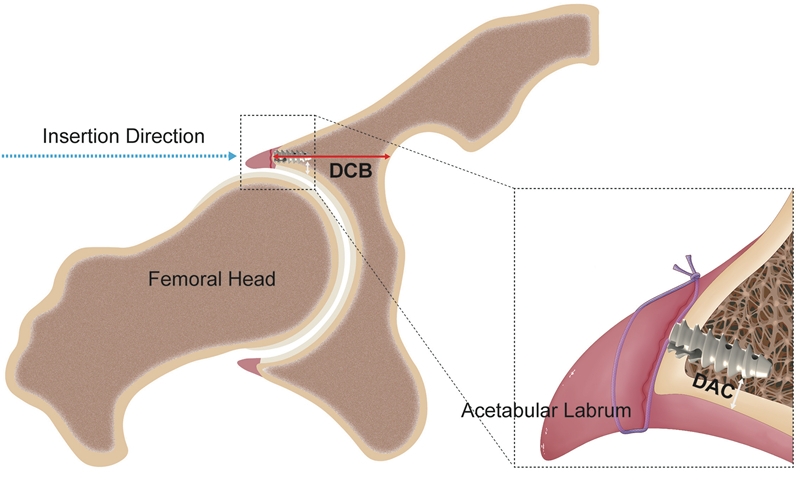 研究利用CT影像资料重建20例髋关节的三维模型,计算机模拟髋关节镜下缝合锚钉置入过程。通过锚钉与关节软骨距离(the distances from the anchor to the articular cartilage,DAC)和锚钉置入点到皮质骨距离(the distances from the acetabular insertion point to the cortical bone,DCB)定量评价髋关节镜入路在髋臼前方4点至后方8点放置缝合锚钉的安全性。