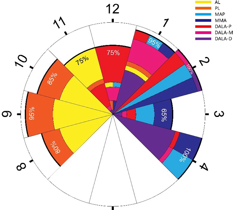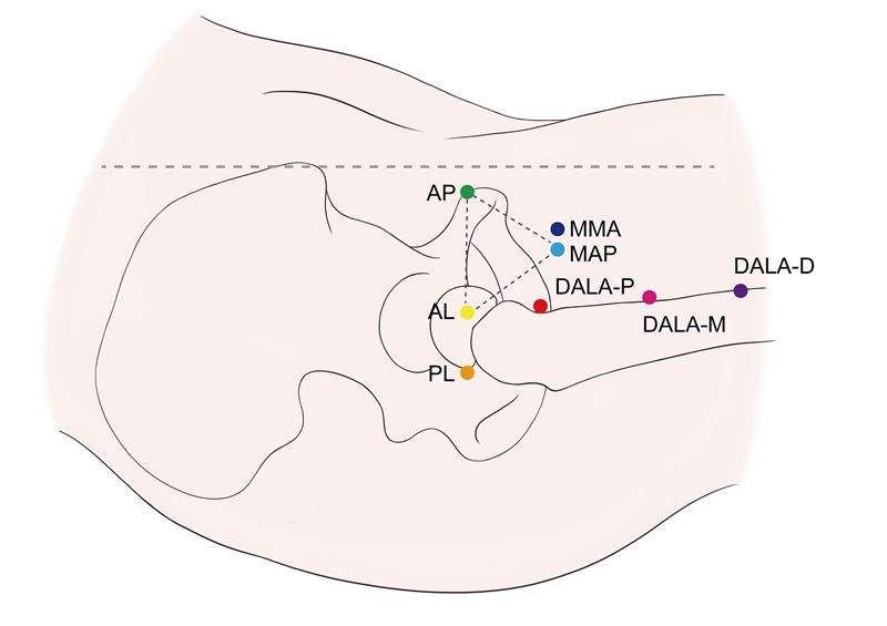 研究中不仅包含了常用的前外入路(anterolateral portal,AL)、后外入路(posterolateral portal,PL)、中前入路(midanterior portal,MAP)和由近及远的三个远前外辅助入路(distal anterolateral accessory portals,DALA),分别是近端DALA(DALA-P)、中间DALA(DALA-M)和远端DALA(DALA-D)。此外,研究中提出了内移中前入路(medial midanterior portal, MMA)以改善前方髋臼放置缝合锚钉的安全性。