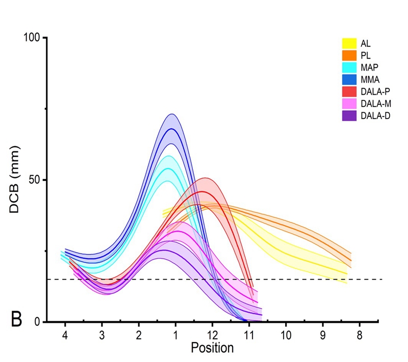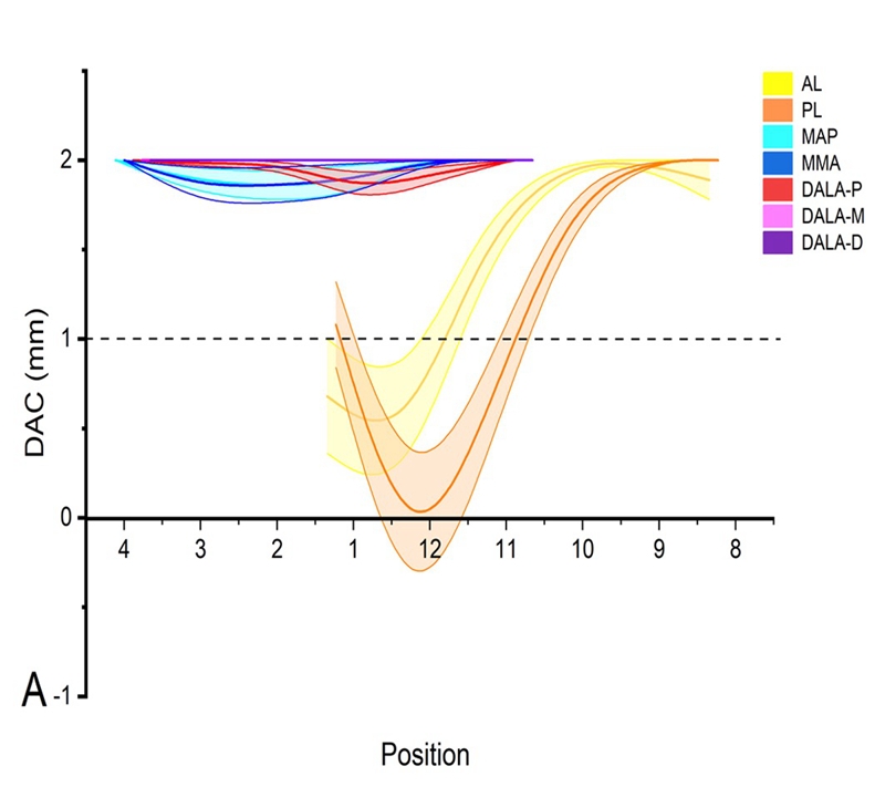 另一方面,研究发现某些入路在放置缝合锚钉时具有较小的DCB, 更容易发生髋关节皮质穿透(cortical bone penetration,CBP)。他们分别是DALA-P入路在3点位置(8.93±2.12mm;P<.001)和11点位置(9.59±2.84mm;P<.001),MAP入路在12点位置(13.76±3.89mm;P<.001)和11点位置(0.27±0.27)mm;P<.001), MMA入路在12点位置(5.96±2.31mm;P<.001)和11点位置(0mm;P<.001)。