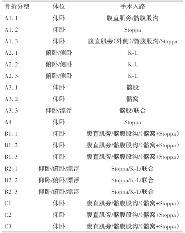 推荐意见4:三柱分型中前方受力型(A1型、B1型及C型)损伤,仰卧位前方入路处理骨折;后方受力型(A2型)损伤,俯卧位或侧卧位经K-L入路处理骨折;中部受力型(B2型)损伤,优先处理移位更明显的“柱”,尽量单一入路处理主要骨折块,必要时前后联合入路处理;顶部受力型(A3型)损伤,仰卧位单一入路(髂窝或髂股)处理骨折块(证据等级:B;推荐强度:强)。