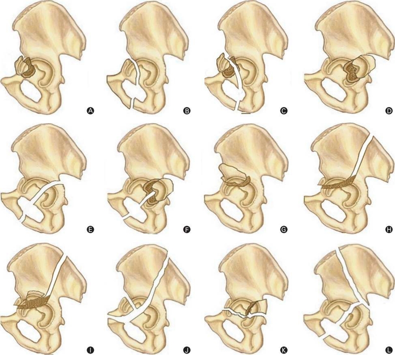 A. A1.1型损伤(单纯前壁骨折);B. A1.2型损伤(单纯前柱骨折);C. A1.3型损伤(复杂前柱骨折);D. A2.1型损伤(后壁骨折);E. A2.2型损伤(单纯后柱骨折);F. A2.3型损伤(后柱/后壁骨折);G. A3.1型损伤(顶壁骨折);H. A3.2型损伤(单纯顶柱骨折);I. A3.3型损伤(复杂顶柱骨折);J. B1型损伤(顶前柱骨折);K. B2型损伤(前后柱骨折);L. C型损伤(三柱骨折)
