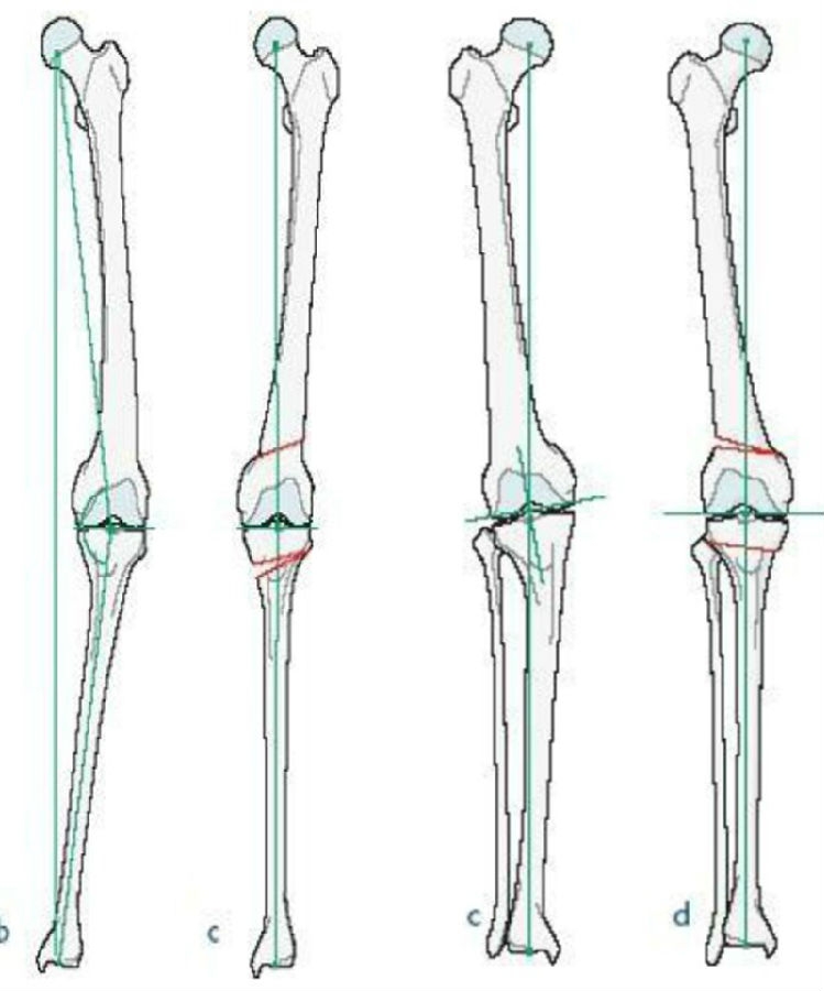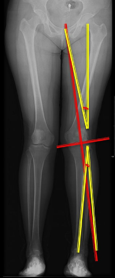 患者在整体力线上既可以表现为膝内翻,也可以表现为膝外翻。有研究表明,内翻膝股骨畸形占59%,内翻膝胫骨侧畸形占31%,内翻膝股骨+胫骨畸形占10%;外翻膝股骨畸形占22%,外翻膝胫骨畸形占45%,外翻膝股骨+胫骨畸形占33%。