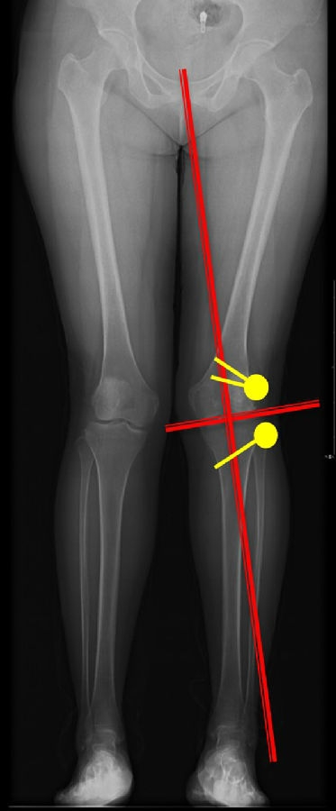 画下肢机械轴,股骨头中心链接踝关节中心判断患者为内翻畸形还是外翻畸形。此患者为外翻畸形。