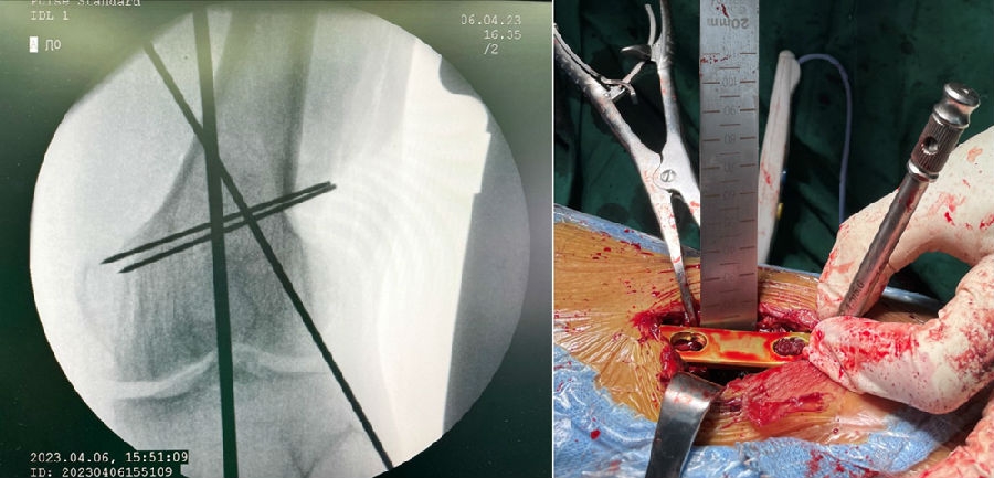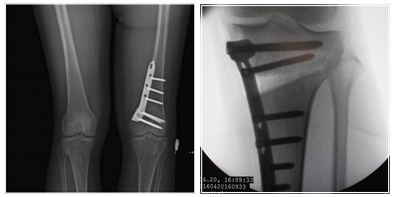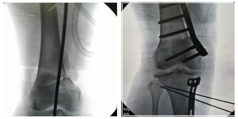 对于手术顺序,提倡先做股骨。当股骨闭合,胫骨开放时,推荐优先做股骨,有利于准确调整下肢力线;当股骨闭合,胫骨闭合,同样推荐先做股骨,不容易发生相应的并发症。但是当出现术前全长片不标准,术前计划不准确时,建议先胫骨,胫骨较容易看关节线。