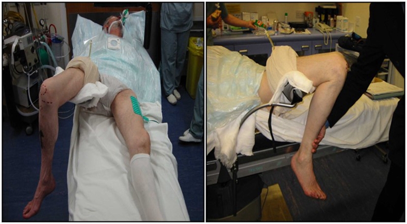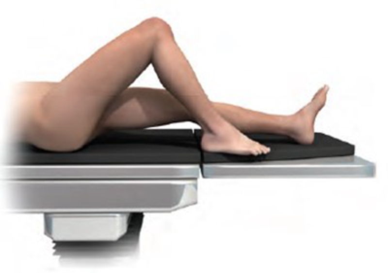 悬吊体位腿架(Biomet)-不要放在腘窝,病人在病床边缘,屈髋40°和外展30°;腿自然下垂,膝屈曲110º;全膝关节可以完全屈曲。