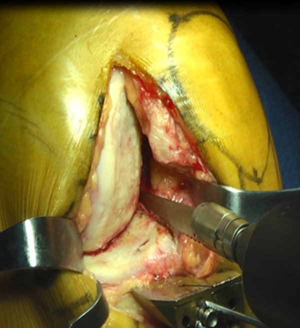 股骨远端截骨强调0°伸直位截骨,确保股骨远端截骨面垂直股骨于机械轴。