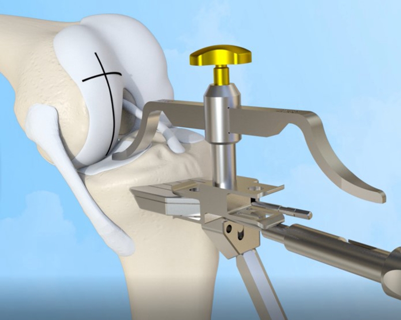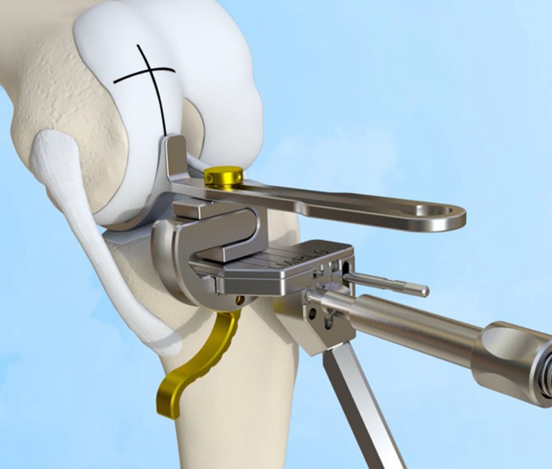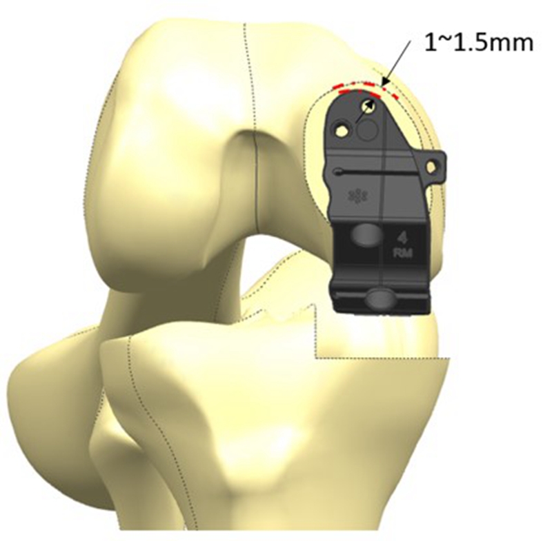 截骨定位器前缘应小于股骨远端截骨面前缘;截骨定位器垂直于胫骨截骨面;股骨截骨定位器参考胫骨平台中线,略偏外。