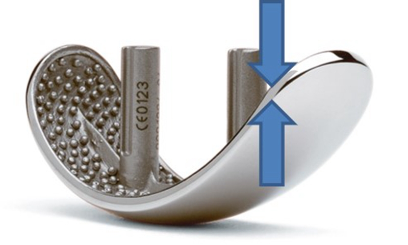 假体是曲面对平面接触,低接触面积,高接触应力,聚乙烯磨损机会增加,为了增加垫片耐磨性,胫骨侧截骨量大。