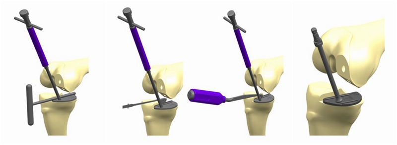 先测量胫骨大小,确保齐平胫骨平台后缘,随后专用牙刷锯制备胫骨龙骨槽,最后固定栓钻孔(20°)。