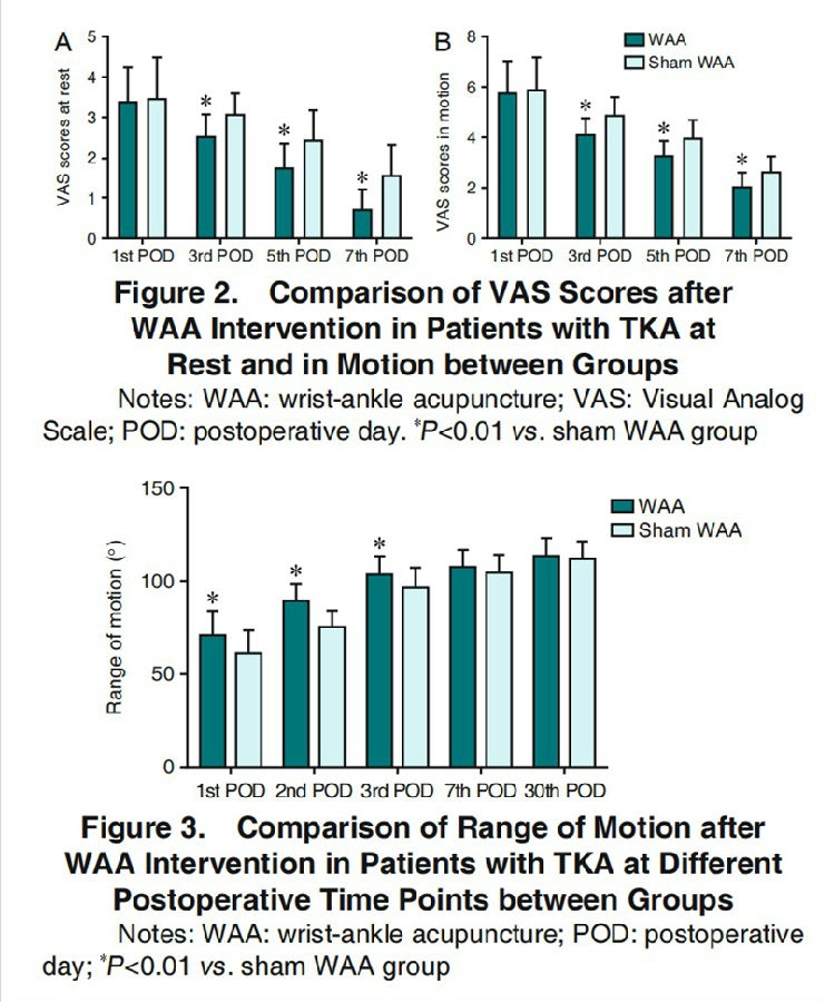华北理工大学的刘建明教授团队提出腕踝针灸(WAA)作为一种新方法,避免了传统针灸的不适感,有望提高患者接受度。研究采用了视觉模拟评分(VAS)评估疼痛程度,并测量了多个指标如膝关节活动度、主观直腿抬高时间等,以比较WAA和假腕踝针灸的效果。该方法在术后3天、5天和7天的安静和运动状态下表现出比对照组更低的VAS评分,膝关节活动度也显著优于对照组。患者控制镇痛泵内舒芬太尼的使用量显著减少。安全性评估显示WAA治疗组无严重不良事件。