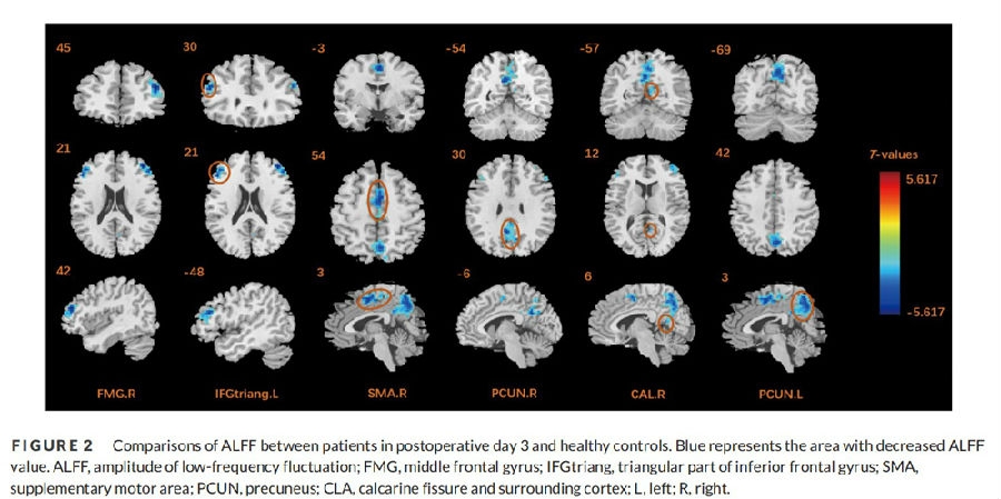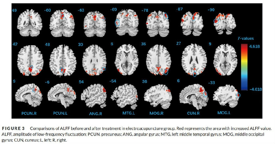 来自河南中医药大学和上海中医药大学的团队研究了电针治疗TKA后疼痛的问题。通过静息态功能性磁共振成像(rs-fMRI)对患者大脑区域的扫描,评估疼痛程度。采用了随机、单盲、假针刺对照的设计,招募40名术后急性疼痛患者,分为电针组和假针刺组。电针组接受针刺治疗,而假针刺组采用了不穿透皮肤的假针,治疗持续5天。研究结果显示,在术后急性疼痛患者中,特定脑区的功能活动降低。经过电针治疗后,患者的部分脑区功能活动得到提高,尤其是双枕叶。在电针组中,患者在术后第7天显示出特定脑区的活动显著增加,与健康对照组相比。研究结果支持电针治疗对改善TKA后急性疼痛患者的神经可塑性具有积极效果。