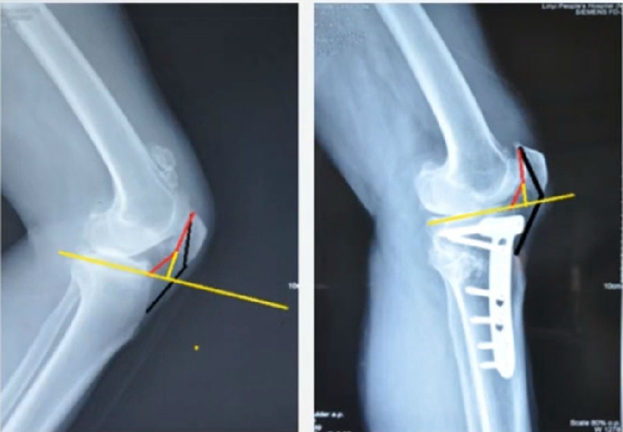 第二次来院做另一侧肢体时,采用下行截骨,术后患者髌骨高度,无论用哪种方法测量都无明显变化,而且患者膝关节功能迅速得到恢复。