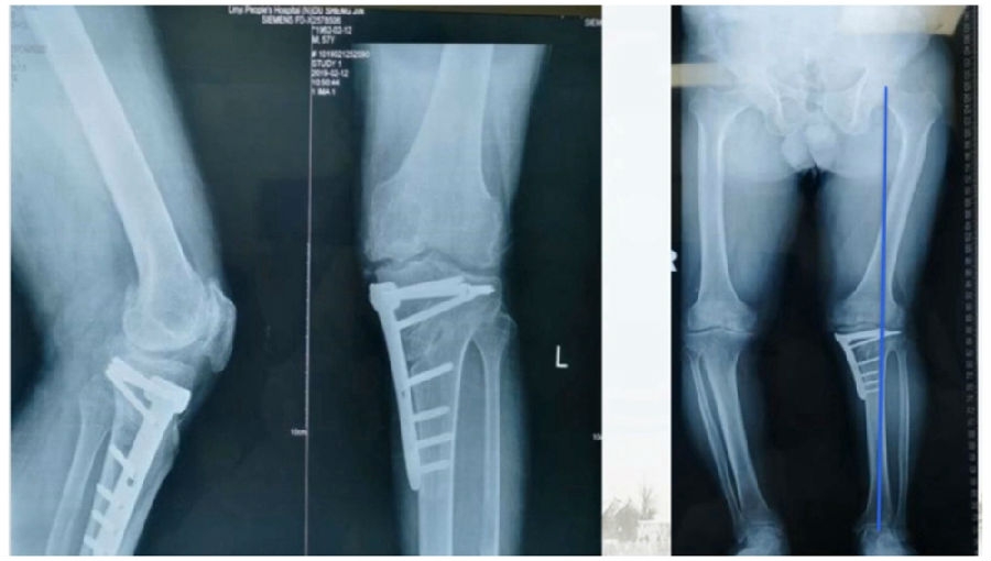 术后检查证实达到了术前预期的手术效果,关节线达到了平行,半脱位得到矫正,同时关节线和地面水平。病人行走达到了理想的效果。