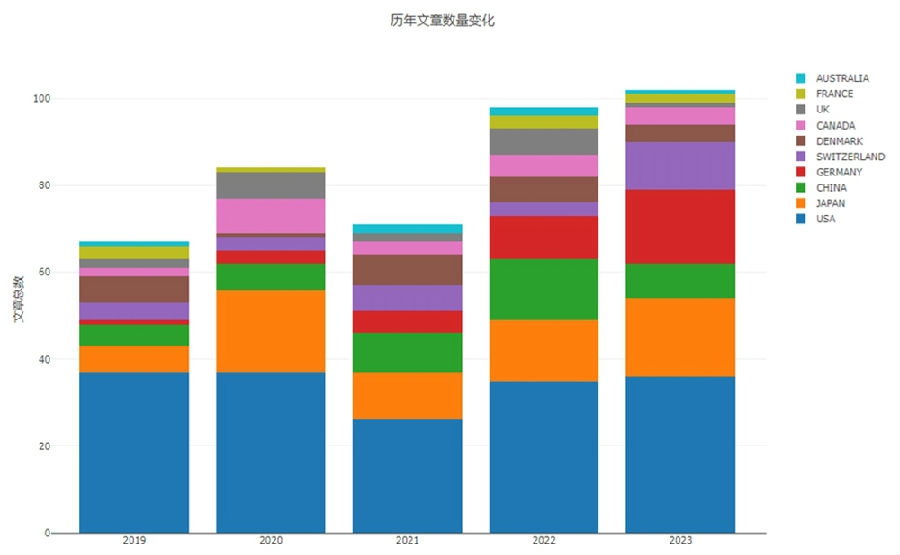 比较近5年的国际合作,2023年似乎还没有从疫情的影响中完全恢复过来,国际合作研究较少。