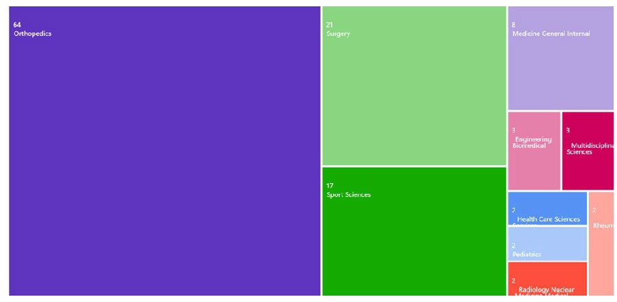 通过Web of Science对 2023年截骨保髋论文初步分类,最大的分类是属于骨科分类的64篇、外科分类21篇、运动科学分类17篇、内科学8篇、生物医学3篇、跨学科3篇、保健医学2篇、放射学2篇、风湿免疫2篇……