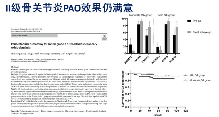 笔者团队的张振东医生在《Int Orthop》上发表了题为"Periacetabular osteotomy for Tönnis grade 2 osteoarthritis secondary to hip dysplasia"的文章。我们以往认为骨关节炎是成人保髋的禁忌,这篇文章更新了我们对于骨关节炎患者疗效的认识。