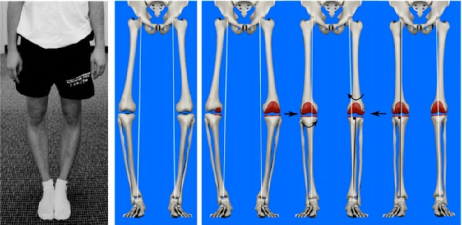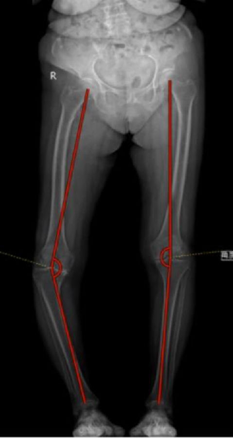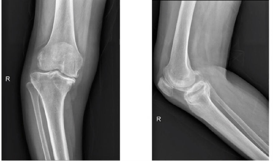 PE:双膝内翻畸形,左膝稍肿胀,左膝活动度屈曲100°,伸直0°,内侧关节间隙压痛(+),浮髌试验(-),右膝稍肿胀,活动度屈曲100°,伸直0°,内侧关节间隙压痛(+),浮髌试验(-),双下肢皮肤感觉及末梢血运正常。