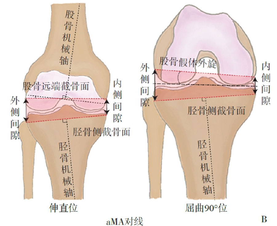 ①调整机械轴对线(aMA),在MA基础上衍生而来,胫骨截骨面与胫骨机械轴呈90°,通过调整股骨侧截骨量和假体位置,保留冠状面上轻度关节畸形(<3°);