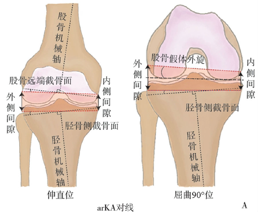 ③限制性运动学对线(rKA),遵循KA的主要技术原则,保留股骨侧假体的运动轴对线,通过微调胫骨侧假体的位置来调整下肢力线和关节面倾斜度;