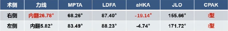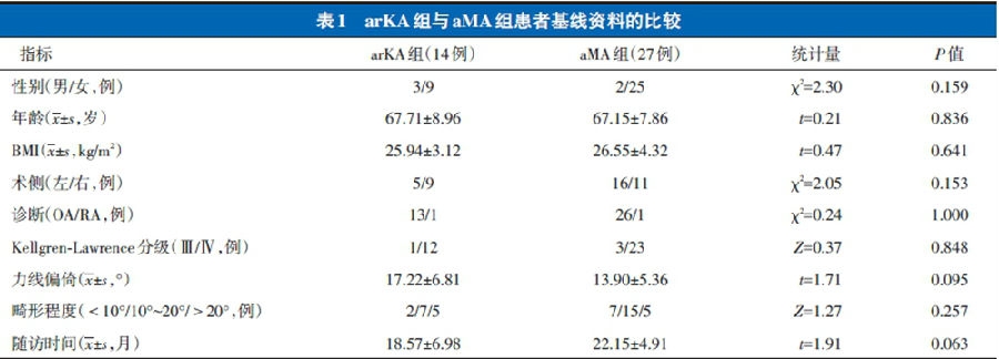 笔者团队回顾性分析2019.10-2021.09,导航辅助TKA应用arKA对线的14例连续病例,选取同期同一手术团队应用aMA对线的27例连续病例作为对照组,初步应用结果如下表。两组患者术前一般资料比较差异均无统计学意义(p>0.05),具有可比性。