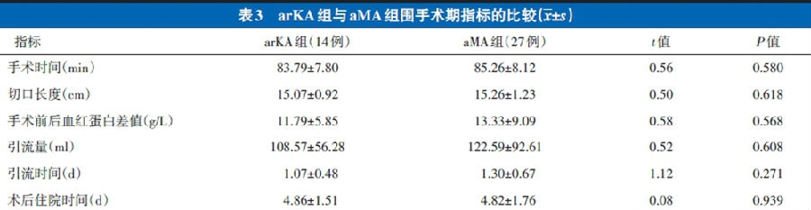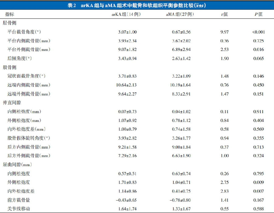 arKA组术中胫骨平台截骨角度、平台外侧截骨量、屈曲间隙外侧松弛度、屈曲间隙内外松弛度差明显大于aMA组,差异均有统计学意义(p<0.05)。