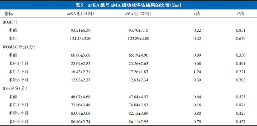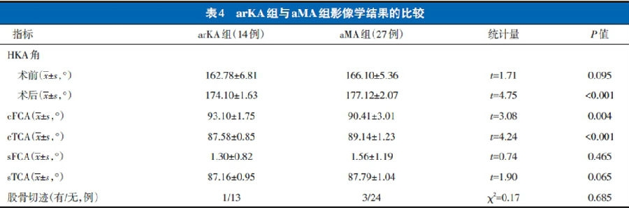 arKA组术后HKAA、cTCA明显小于aMA组,arKA组cFCA明显大于aMA组,差异均有统计学意义(p<0.05)。