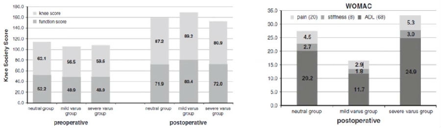 对于为何术后目标力线内翻残留3°~6°,Vanlommel的一项研究连续观察了132名(143膝)术前是内翻膝的患者,平均随访7.2年。根据术后下肢力线将其分为三组,中立组(0-3°),轻度内翻组(3-6°)和严重内翻组(>6°)。对比发现残留轻度内翻组的KSS评分及WOMAC指数均较中立组和严重内翻组明显更好。