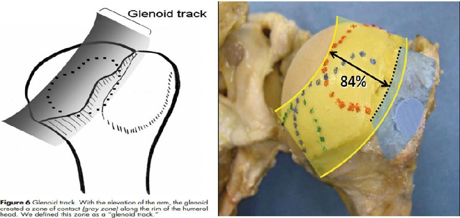 当手臂上举时,肩胛盂与肱骨头的接触区域会从肱骨头的中下部向外上部分转移,这个相互的接触区域就被称为肩胛盂轨迹。接触区域的内侧缘到肩袖止点的内侧缘的距离约为84%肩胛盂的宽度。