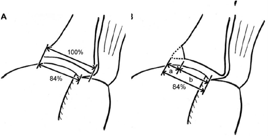 当没有肩胛盂骨缺损时,肩胛盂轨迹的宽度占了肩胛盂宽度的84%。当有肩胛盂前缘骨缺损时,应该从这84%的长度中减去骨缺损的宽度,这样才能够获得一个真正的肩胛盂轨迹的宽度。