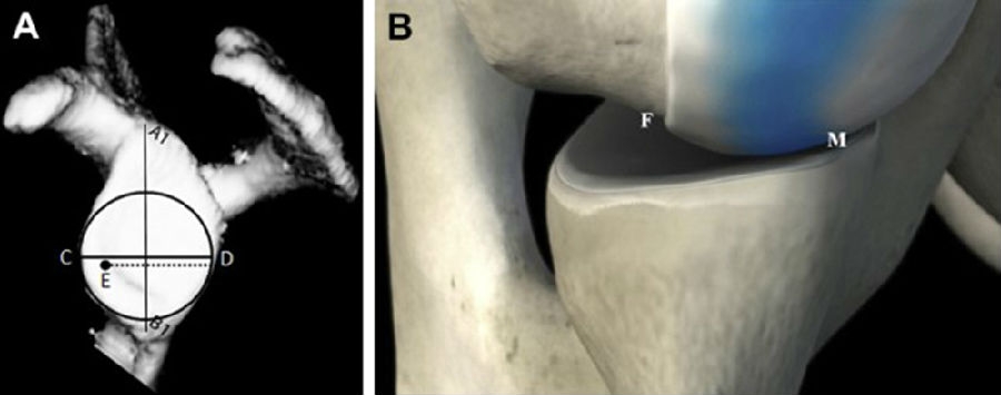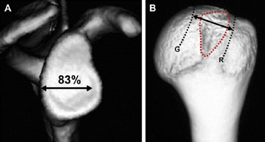 运动员肩关节前方不稳定一般伴随不同程度的关节盂骨缺损。Burkhart和De Beer首先定义了“显著性”骨缺损,肩盂骨缺损最常见于关节盂前缘。目前观点认为:骨缺损超过关节盂总宽度的25%或者关节盂长度的19%-21%认为是“显著性骨缺损”。 明显肩胛盂骨缺损病变的运动员,其复发率达80%。Itoi等提出了“肩胛盂轨迹”(Glenoid track)的观点,来评估双相骨缺损。