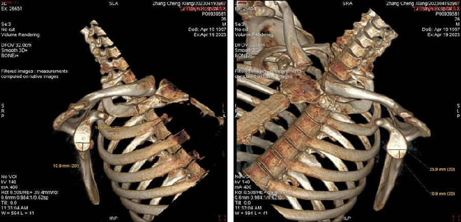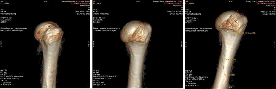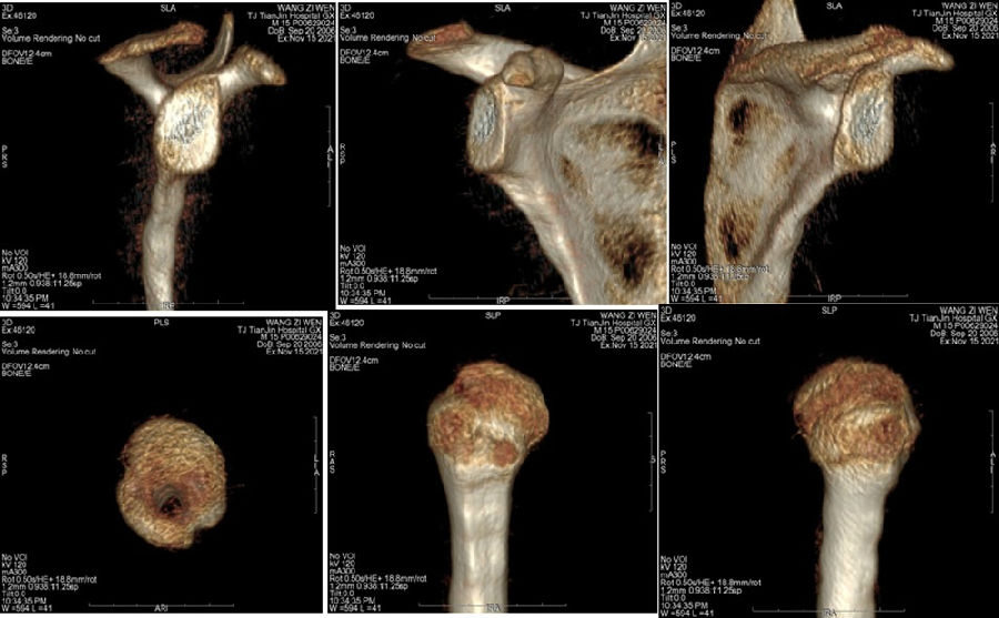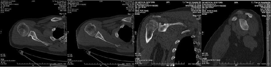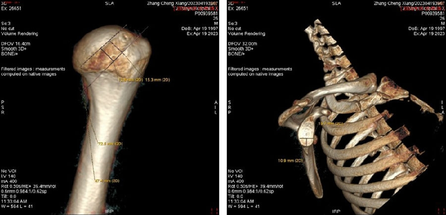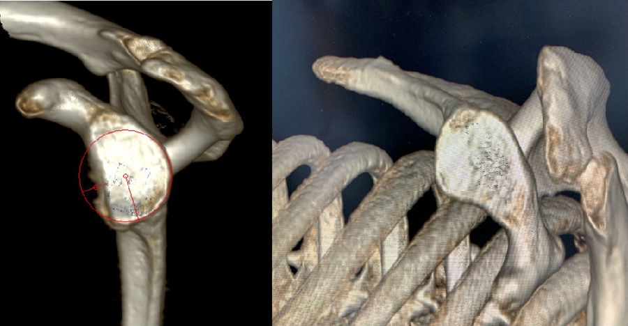 双侧CT三维扫描显示:D=34mm,d=3mm,d/D=肩胛盂骨缺损9%;GT=25.2mm,HIS=30mm。