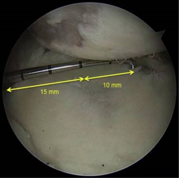 上图为Hill-Sachs损伤的测量方式,采用前端为4mm的探钩,可以看到Hill-Sachs损伤的区域为3个探钩前端的跨度,因此HS为12mm。