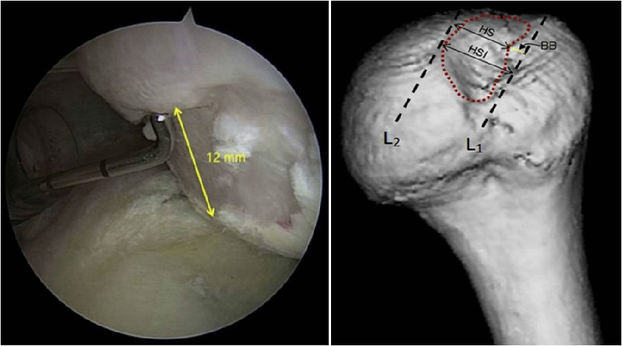 6. 巨大Hill-Sachs损伤,但肩胛盂骨缺损较小或无骨缺损,则建议术前在CT上测量HSI。如果HSI大于83%下肩胛盂直径,则应在进行Bankart修复手术后进行关节镜下的remplissage手术。