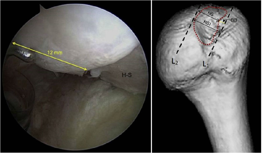 计算Hill-Sachs间距(Hill-Sachs Interval,HIS)。这个间距应为Hill-Sachs损伤的宽度(HS)加上骨桥(Hill-Sachs损伤的外侧缘到肩袖止点)的宽度(BB),HSI:HS+BB=24mm。