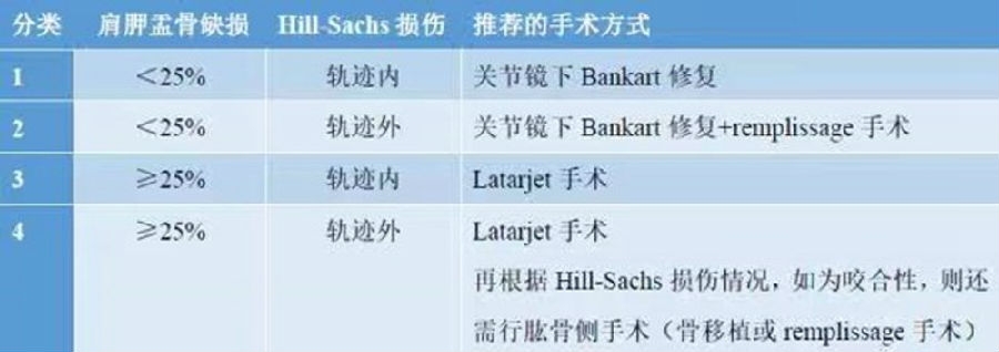 3. 肩胛盂骨缺损大于或者等于肩胛盂直径的25%,那么无论Hill-Sachs损伤的范围多大,都应该进行植骨手术。