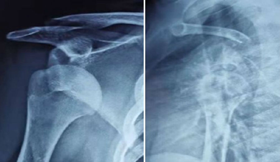 评估报告提示:右肩胛骨关节盂前下缘撕脱骨折,符合骨性bankart损伤。右肱骨头后上缘凹陷骨折,符合Hill-Sachs损伤。Hill-Sachs间隙为13.8mm(<15.3mm),为轨迹内肩关节前脱位。