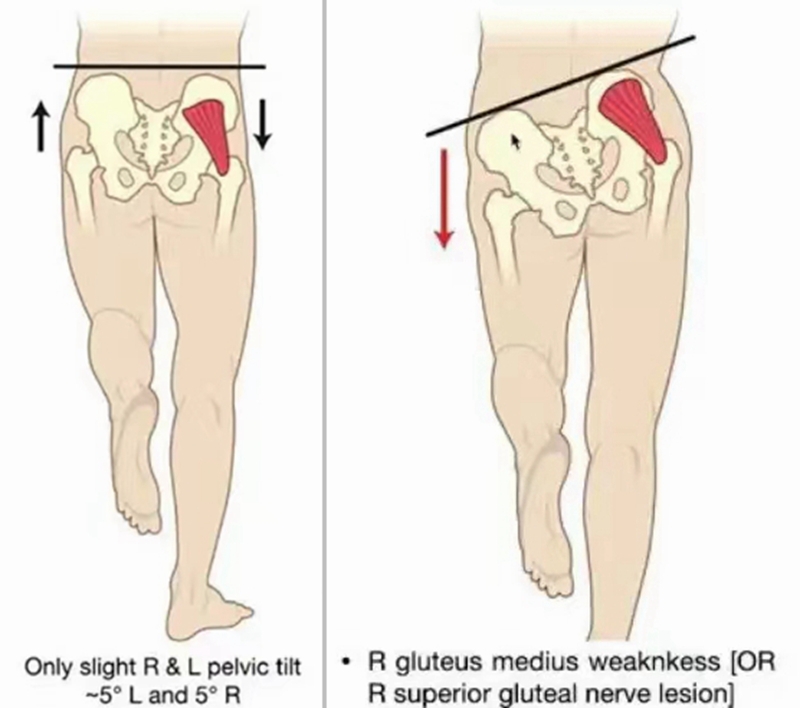测试时让患者一侧下肢支撑,抬起另一侧下肢,如果支撑侧的骨盆向相反的或没有支撑的下肢倾斜,则支撑侧下肢的外展肌无力测试为阳性。严重臀中肌肌腱病或撕裂的患者特伦德伦堡卧位测试呈现阳性。