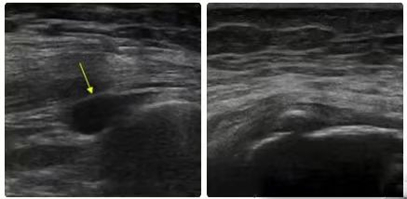 超声检查具有较好的可耐受性、可行性、价格低廉、纤维和血管分布的空间分辨率高等优点,超声检查显示大转子滑囊无回声或低回声液体则提示转子滑囊炎。肌腱的撕裂显示增厚的低回声肌腱伴纤维的连续性中断或者无回声,以及肌腱的钙化。多普勒超声检查可以测量肌腱的厚度和血管的分布。超声检查还可以发现骨侵蚀、肌腱病变和髂胫束增厚等。