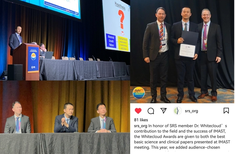 本项研究荣获本届IMAST大会“Whitecloud Award for Best Basic /Translational Science Paper”,这是协和骨科首次获此殊荣。该奖项以脊柱侧凸研究先驱者、IMAST大会创始人Thomas E. Whitecloud教授的名字命名,每年度全球仅遴选一项获奖,具有很高的含金量及影响力。本研究从国际数百项研究中脱颖而出,经过现场所有Member投票及IMAST Committee讨论表决,最终斩获此项大奖,体现了国际学术界对协和骨科研究实力和最新成果的高度认可。