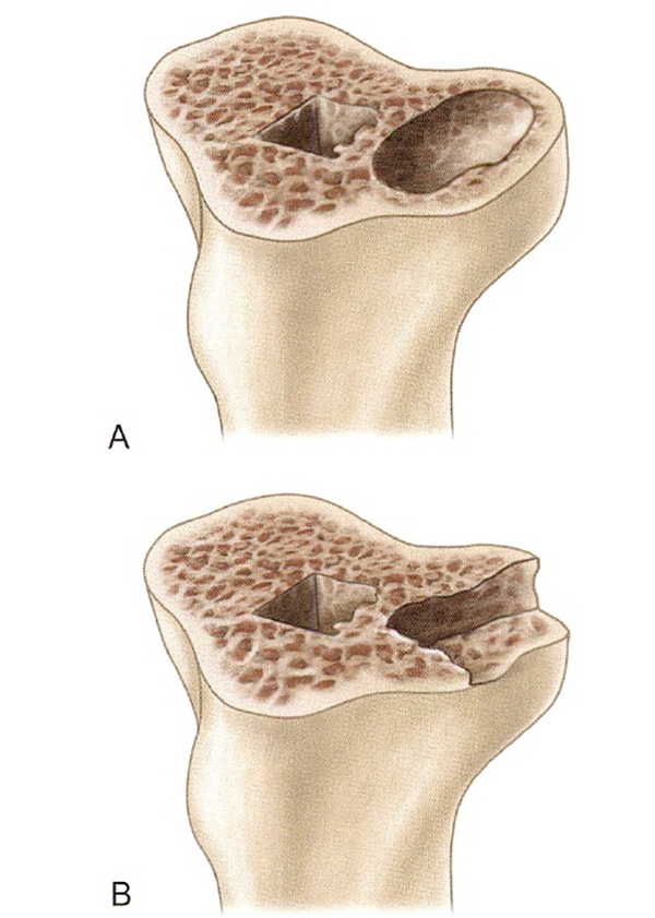 图1 A.包容性缺损有完整的骨皮质边缘环绕缺损区;B.非包容性缺损则靠近周边,缺少骨皮质边缘