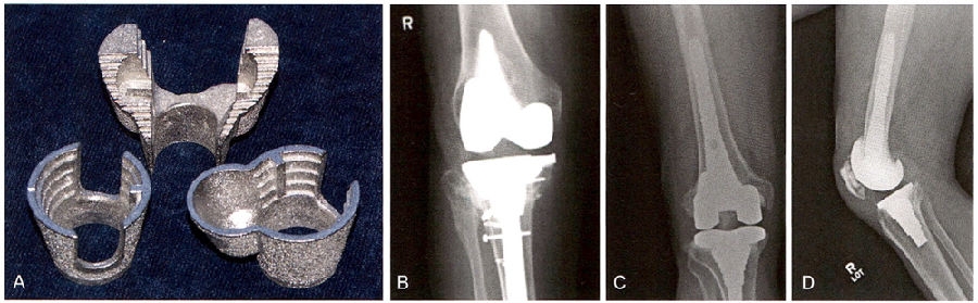 尽管目前在初次置换中常常作为非必要部分多孔金属加强块和锥形袖套的报道应用的效果较好(图5A)。把锥形袖套压配到股骨远端或胫骨近端的包容性骨缺损中,并用骨水泥把假体粘贴于这些加强块上使其成为一体。还可以把锥形袖套和假体组合形成一体式的假体结构。包容性骨缺损中,锥形袖套也可以粘在假体上组合形成单一假体结构。诸如图5B和C。这些方法大部分应用于伴有明显骨缺损的翻修手术中。这些锥形袖套的骨整合能力非常好,甚至假体失败后也很难取出。