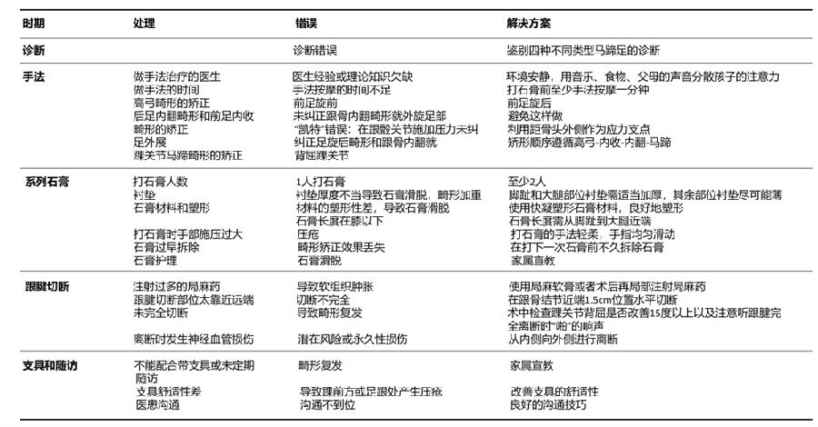 表1. 基于使用Ponseti方法治疗马蹄足的不同时期所最常见的错误